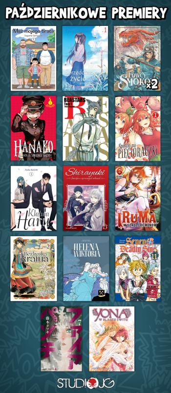 Będą to: "Hanako, duch ze szkolnej toalety" 1, "Sprzedałem swoje życie za 10 000 jenów rocznie" 1, "Mąż mojego brata" 1 i podwójne wydanie (w twardej i miękkiej oprawie) mangi "Łowczy smoków" 1, a także przedpremierowo: "Beastars" 1, "Sposób na pięcioraczki" 1, "Klątwa Haru" 1, W prenumeracie z dodatkami (plus bonusem festiwalowym w postaci kart kolekcjonerskich od 3 premier wzwyż) można zamawiać jeszcze tylko do 11 października!