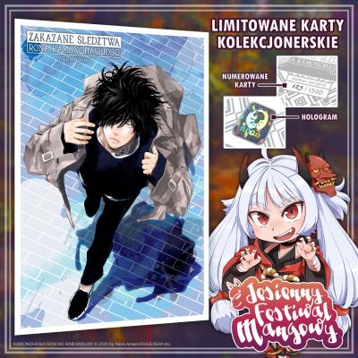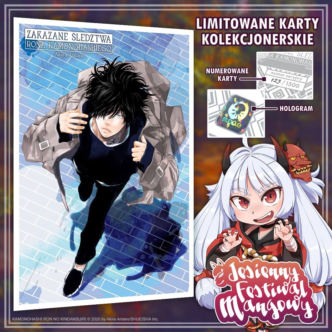 Pora na ujawnienie limitowanej karty kolekcjonerskiej z serii „Zakazane śledztwa Rona Kamonohashiego”! Szykujcie się na opowieść o ekscentrycznym detektywie i jego zakazanych śledztwach. Jeśli lubicie czarny humor i kryminalne zagadki – to tytuł idealny dla Was! Przypominamy, że aby otrzymać karty kolekcjonerskie, należy kupić pierwszy tom minimum trzech festiwalowych serii w prenumeracie do 23 października - szczegóły zabawy na stronie Jesiennego Festiwalu Mangowego!