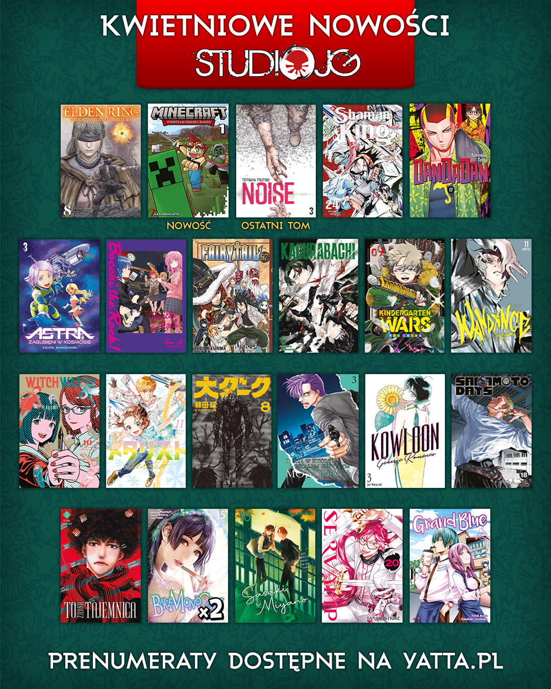 Przybywamy z kolejną porcją nowości wydawniczych! Po bardzo długim oczekiwaniu „Minecraft: Podróż na kraniec świata" dostał w końcu pełny approval i trafi do Waszych rąk w tym miesiącu - manga jest przezabawną komedią i z pewnością ucieszy nie tylko fanów gry. Dodatkowo w kwietniu żegnamy się z serią „Noise" - to idealna okazja, żeby sięgnąć po ten trzytomowy thriller! Poniżej prezentujemy pełną listę nowości, które dotrą do nas w tym miesiącu. Oprócz tego przypominamy, że na naszej stronie znajduje się też wstępny plan na maj, a przybliżone daty premier innych tytułów możecie sprawdzić w zakładce plan wydawniczy - prenumeraty.KWIETNIOWE PREMIERY WYDAWNICZE: