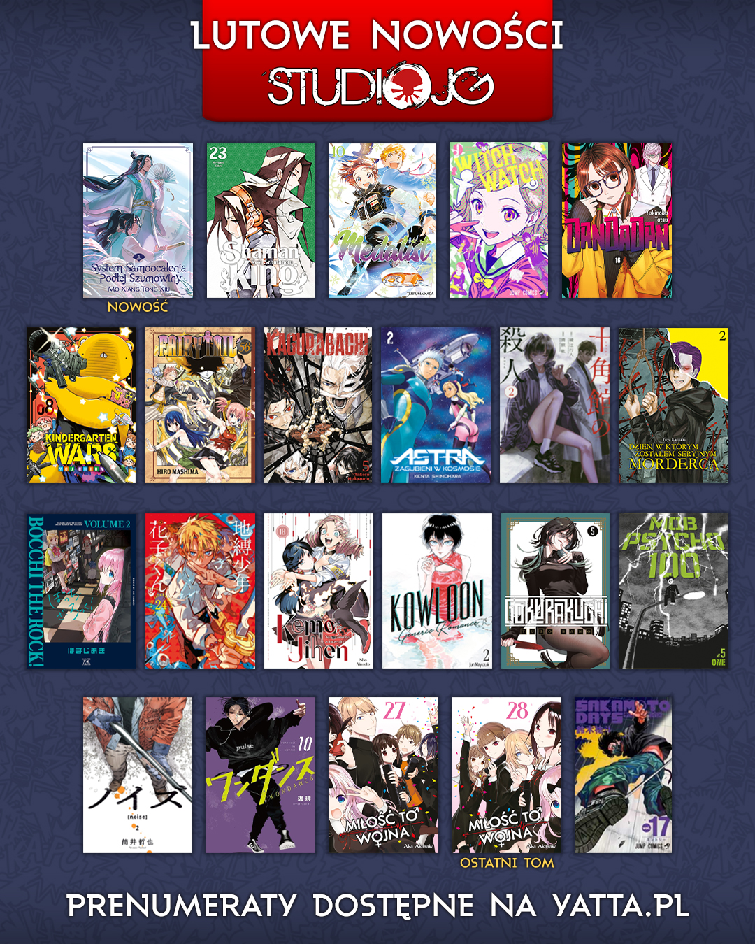 Styczeń za nami - rozpoczynamy zatem kolejny ekscytujący miesiąc! I to nie byle czym, bo swoją oficjalną premierę będzie mieć nasz pierwszy danmei - „System Samoocalenia Podłej Szumowiny"! Przypominamy, że jeszcze tylko do jutra możecie zamawiać prenumeraty na pierwszy tom i zbiorcze pakiety, w których skład on wchodzi. Jeśli więc oprócz dodatków chcecie załapać się na box i duży rabat - to ostatni moment!Mamy też dodatkową niespodziankę - w tym miesiącu podwójną premierą zakończymy serię „Kaguya-sama. Miłość to wojna"! Dwa ostatnie tomy ruszą do Was już pod koniec miesiąca, a dodatkową ciekawostką jest, że ich okładki się łączą. Kto będzie tęsknił za miłosną wojną na intelekty? My na pewno!