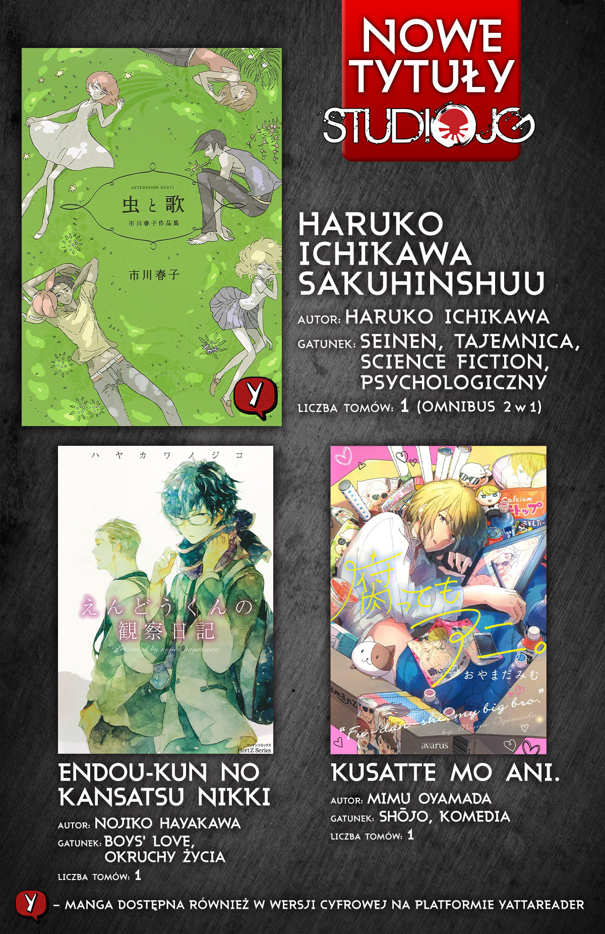 Na dobry początek świątecznego weekendu przybywamy z zapowiedzią trzech jednotomówek! Pierwszą z nich jest absolutnie niezwykła, krótka seria „Haruko Ichikawa Sakuhinshuu", którą wydamy w formie omnibusa. Jest to zbiór opowiadań Haruko Ichikawy, którą znacie już dobrze za sprawą mangi „Kraina klejnotów". Te intrygujące historie, z charakterystycznymi dla autorki motywami fantastycznymi połączonymi z psychologiczną refleksją nad naturą ludzkiego życia, zostaną z Wami na długo po lekturze. Premiera już w czerwcu! Następna na liście jest pięknie ilustrowana jednotomowa manga z gatunku boys' love „Endou-kun no Kansatsu Nikki", która w wyjątkowy sposób przedstawia historię rodzącego się uczucia. Przedpremiera również w czerwcu! A na koniec kolejna letnia nowość - jednotomowa komedia shojo - „Kusatte mo Ani.", opowiadająca o hikikomori, który zdołał zrobić karierę w bezpiecznym zaciszu czterech ścian własnego pokoju!