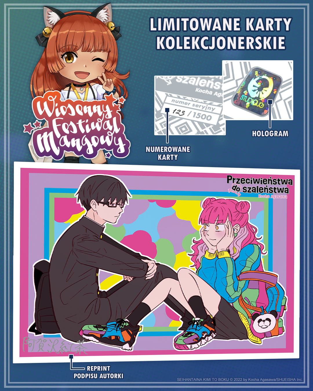 Na dobre rozpoczęcie weekendu prezentujemy Wam limitowaną kartę kolekcjonerską z mangi „Przeciwieństwa do szaleństwa" . Suzuki i Tani w feerii barw udowadniają, że przeciwieństwa mogą się przyciągać! Przypominamy, że aby otrzymać karty kolekcjonerskie, należy kupić pierwszy tom minimum trzech festiwalowych serii w prenumeracie do 11 maja - szczegóły zabawy na stronie Wiosennego Festiwalu Mangowego!