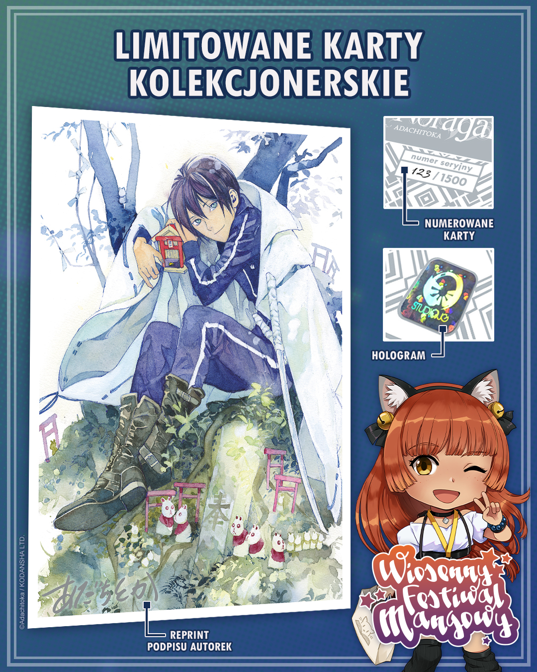 Przed Wami limitowana karta kolekcjonerska z mangi „Noragami" . Yato w akwarelowym wydaniu prezentuje się wyjątkowo Przypominamy, że aby otrzymać karty kolekcjonerskie, należy kupić pierwszy tom minimum trzech festiwalowych serii w prenumeracie do 11 maja - szczegóły zabawy na stronie Wiosennego Festiwalu Mangowego!