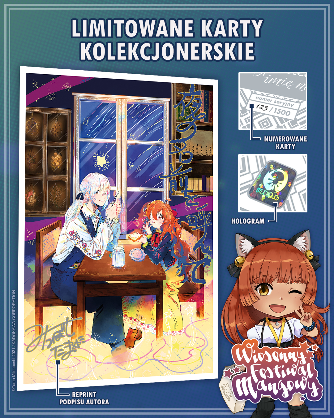 Przed Wami limitowana karta kolekcjonerska z mangi „Wypowiedz imię nocy" . Mira i jej mistrz zachwycają kolorami, spoglądając ze wspaniałej karty festiwalowej! Przypominamy, że aby otrzymać karty kolekcjonerskie, należy kupić pierwszy tom minimum trzech festiwalowych serii w prenumeracie do 11 maja - szczegóły zabawy na stronie Wiosennego Festiwalu Mangowego!